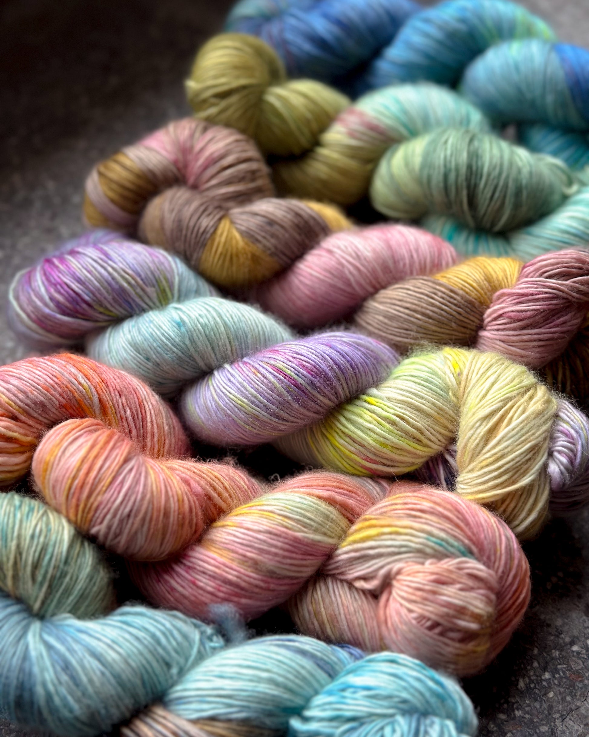 多彩なスペクル(つぶ)と柔らかく広がるグラデーションが織りなす、表情豊かな色の変化を楽しめる毛糸です。