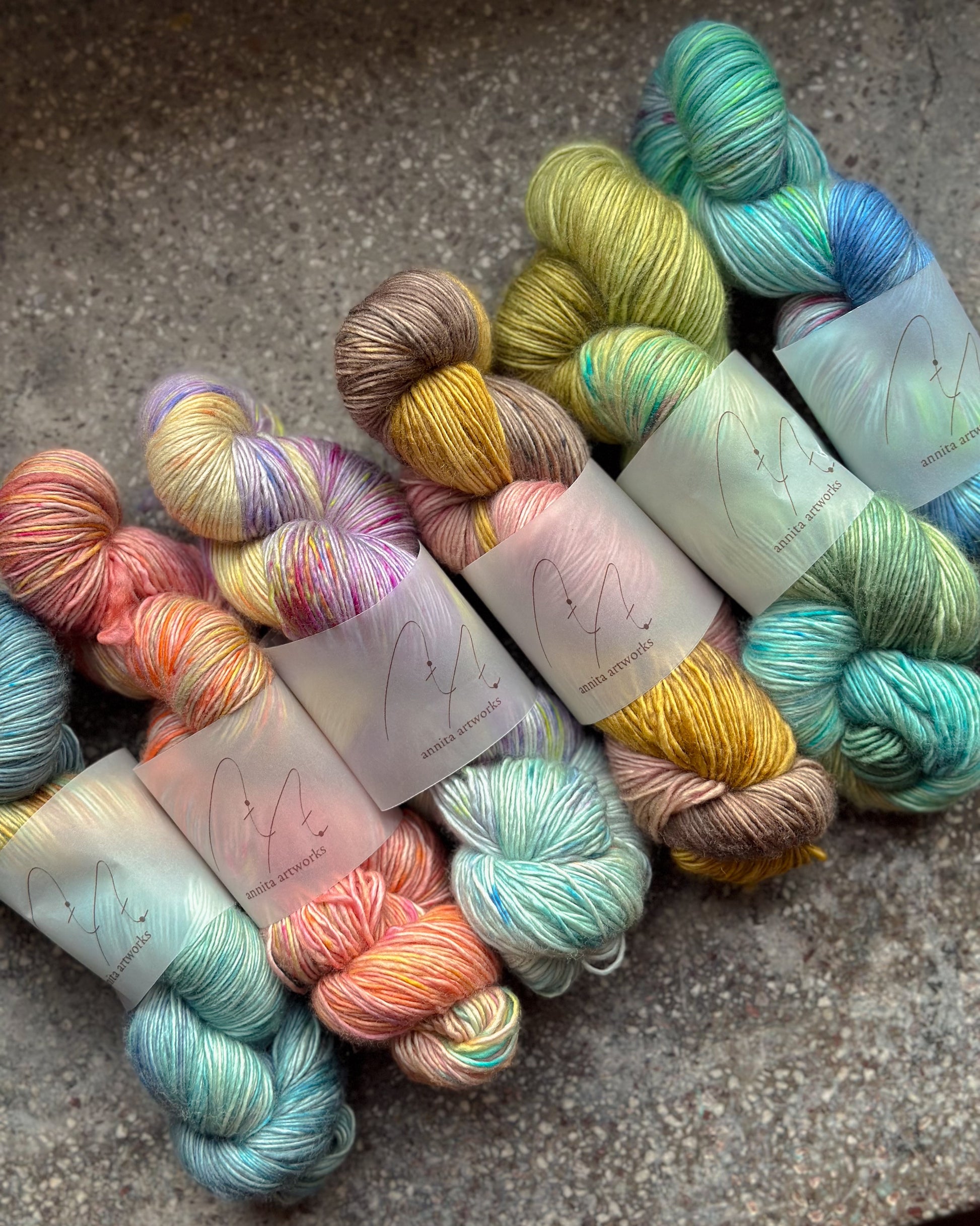 すべて手作業で染めているため、カセごとに色味の違いが生じます。手染めならではの風合いをお楽しみください。