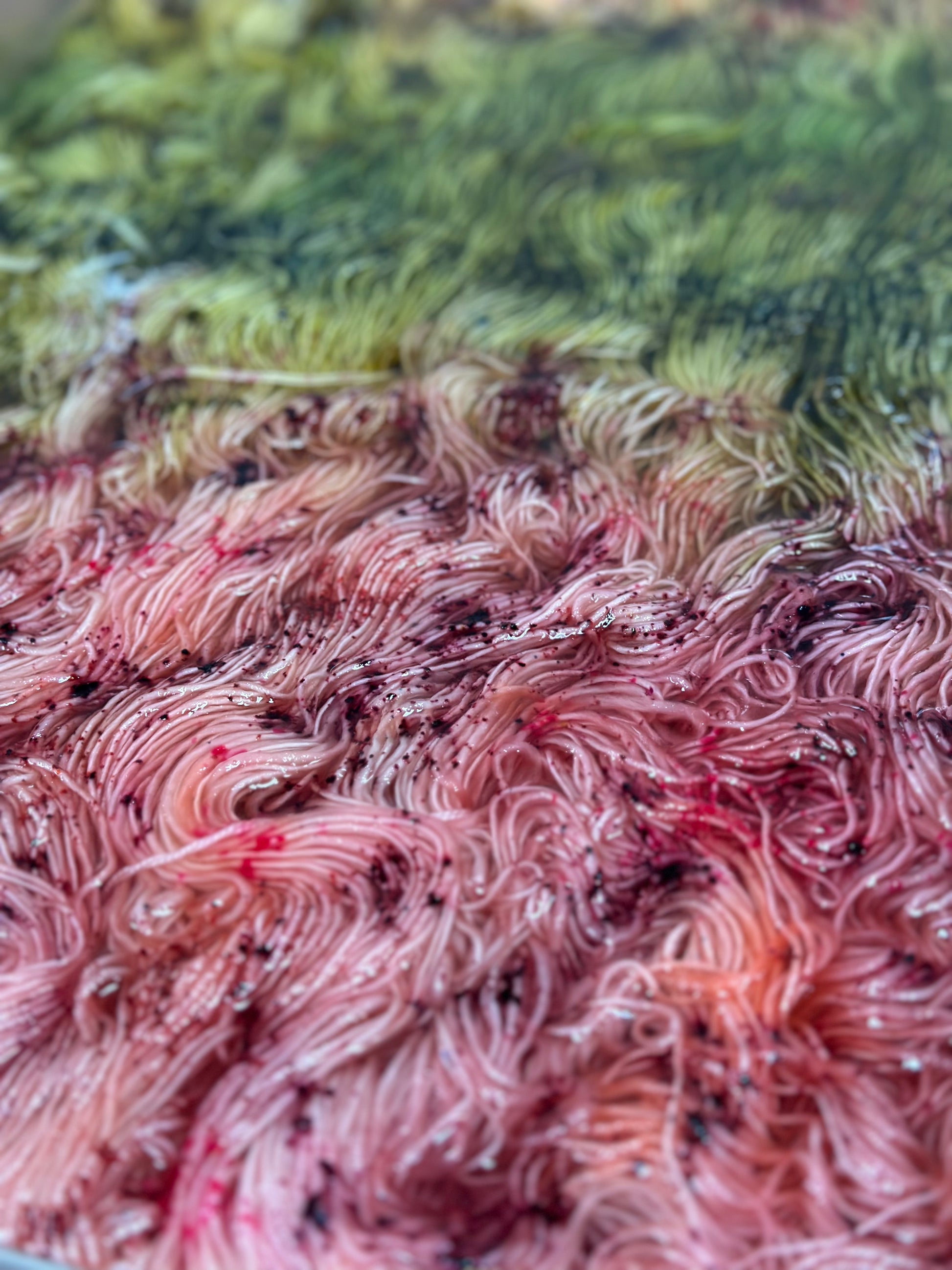 すべて手作業で染めているため、カセごとに色味の違いが生じます。手染めならではの風合いをお楽しみください。