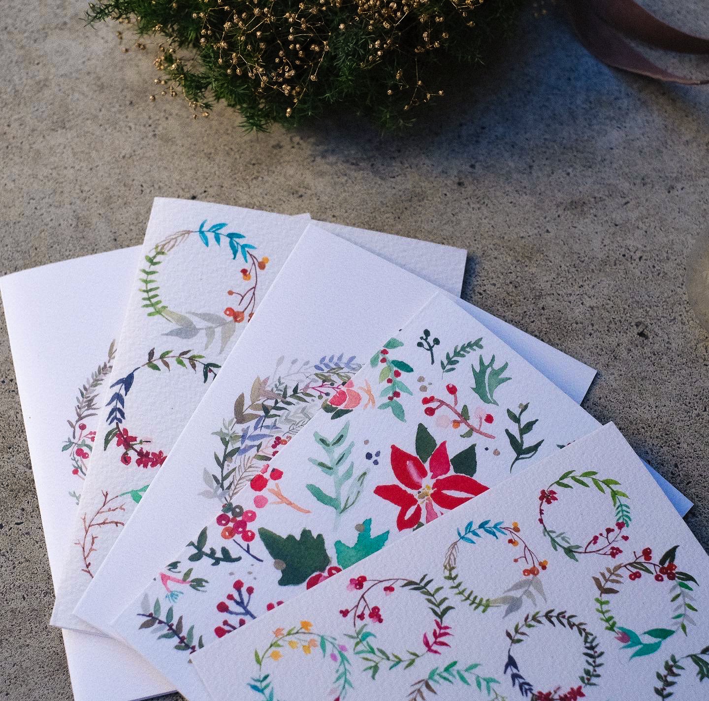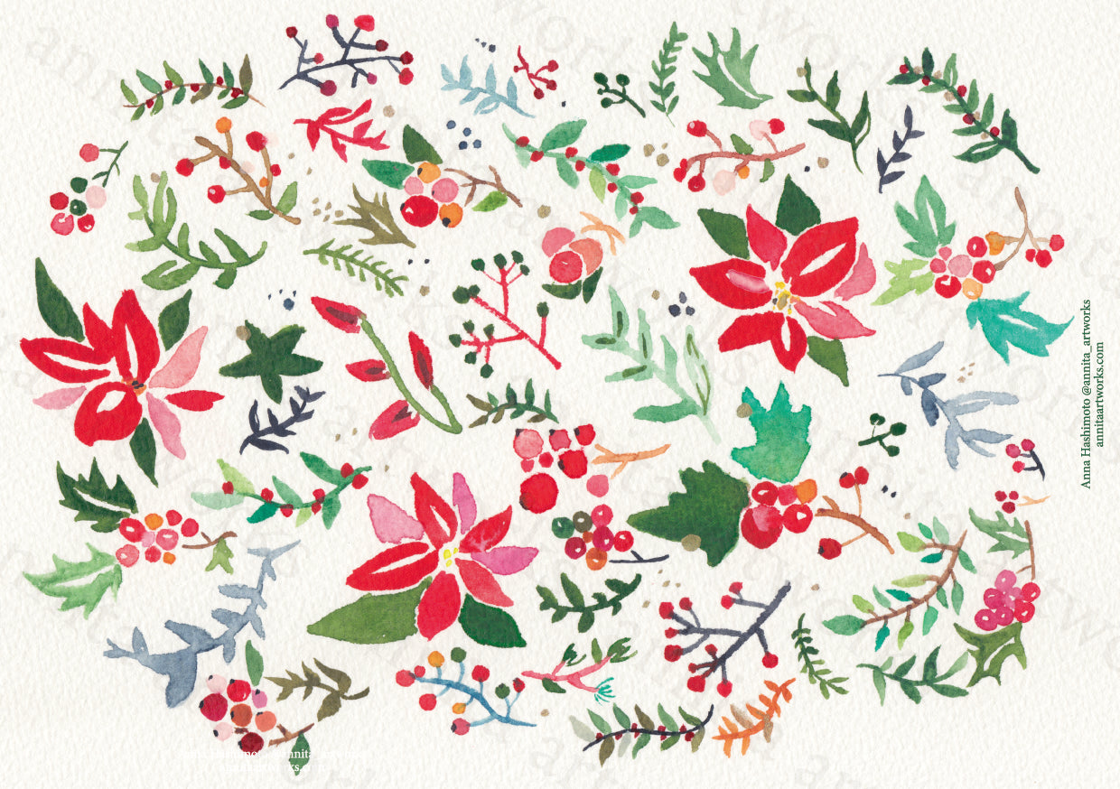 手描きの水彩画をプリントした、クリスマスカード。