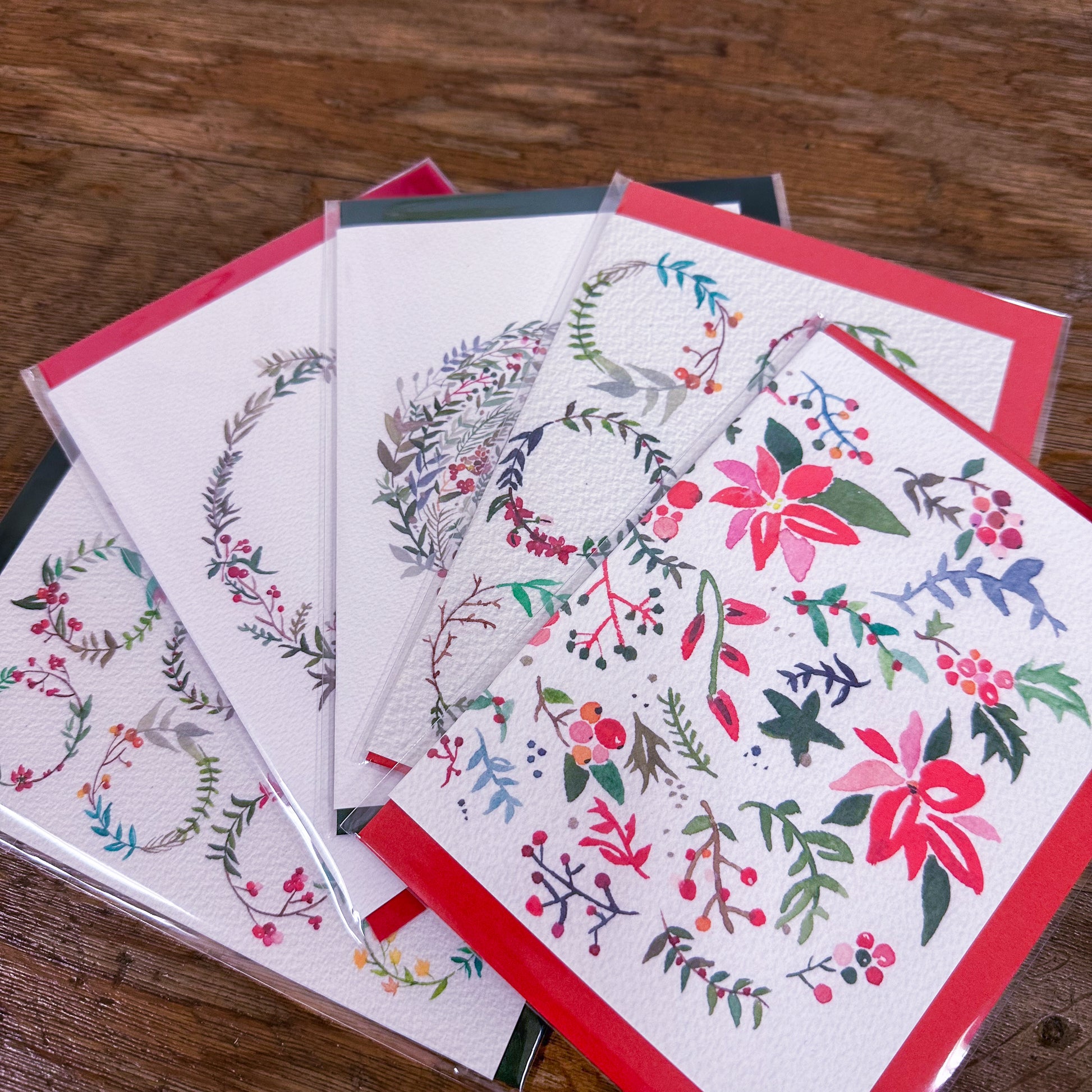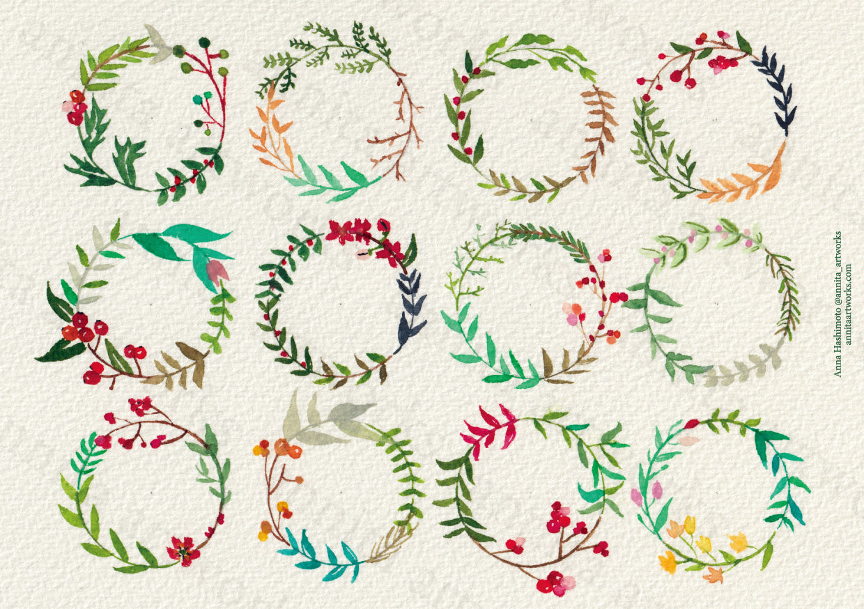 クリスマスモチーフの植物やリースを描いていますが、シンプルなデザインと落ち着いた色合いなので、季節問わずお使いいただけます。