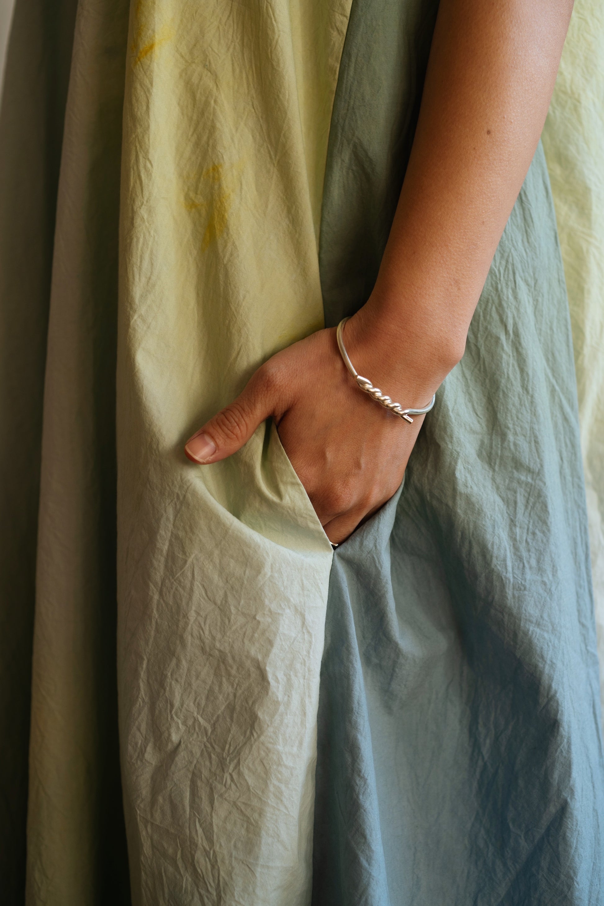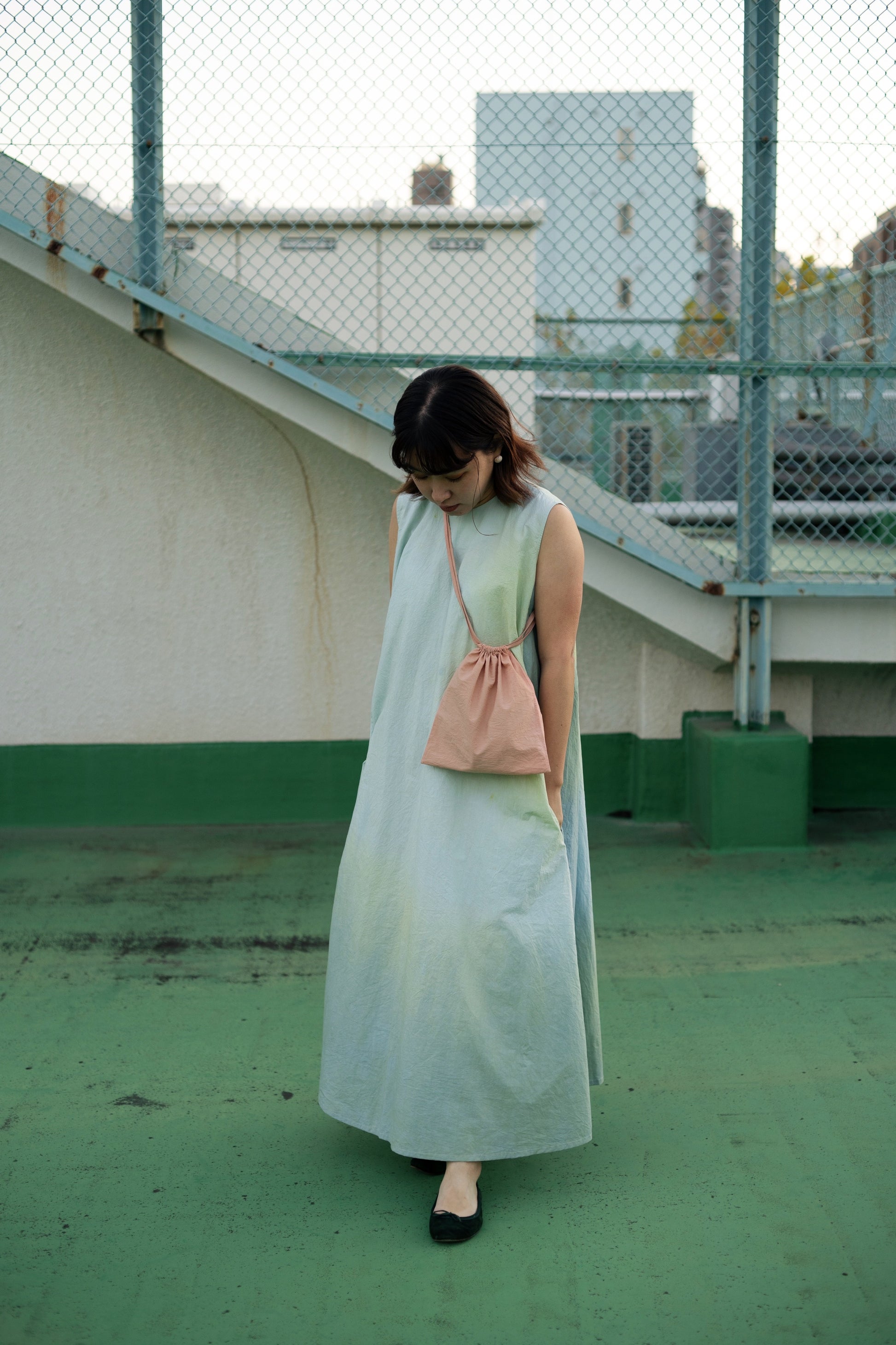 穏やかな海面に広がる波の音が聞こえるような、静けさと透明感をイメージして草木染めで布から染め上げて仕立てたワンピース