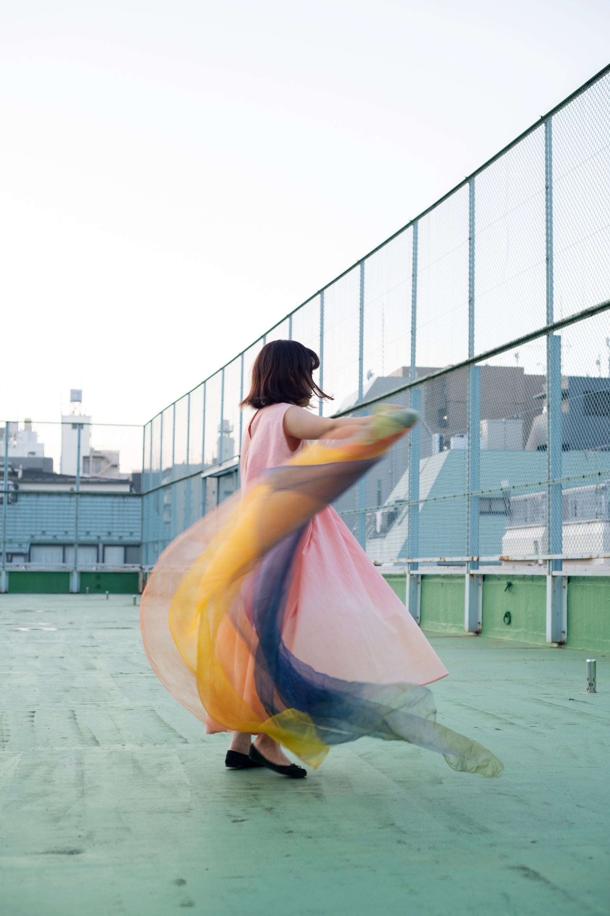 地平線に沈む夕日の輝きをイメージして草木染めで布から染め上げて仕立てたワンピース