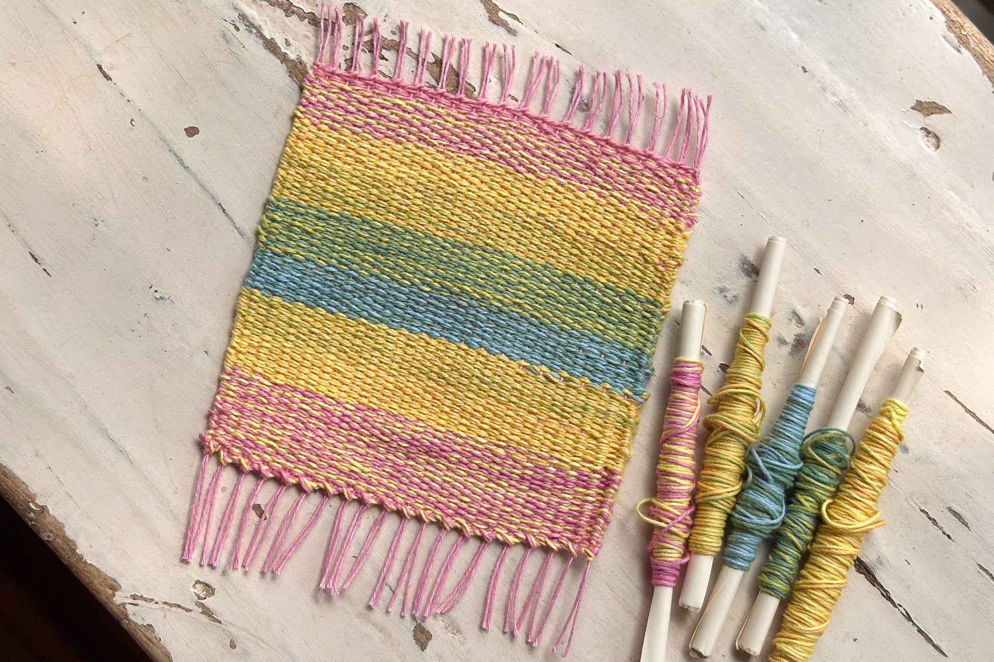草木染めのやさしい色の糸を使って、卓上の機織り機でコースターを作るワークショップです🧵